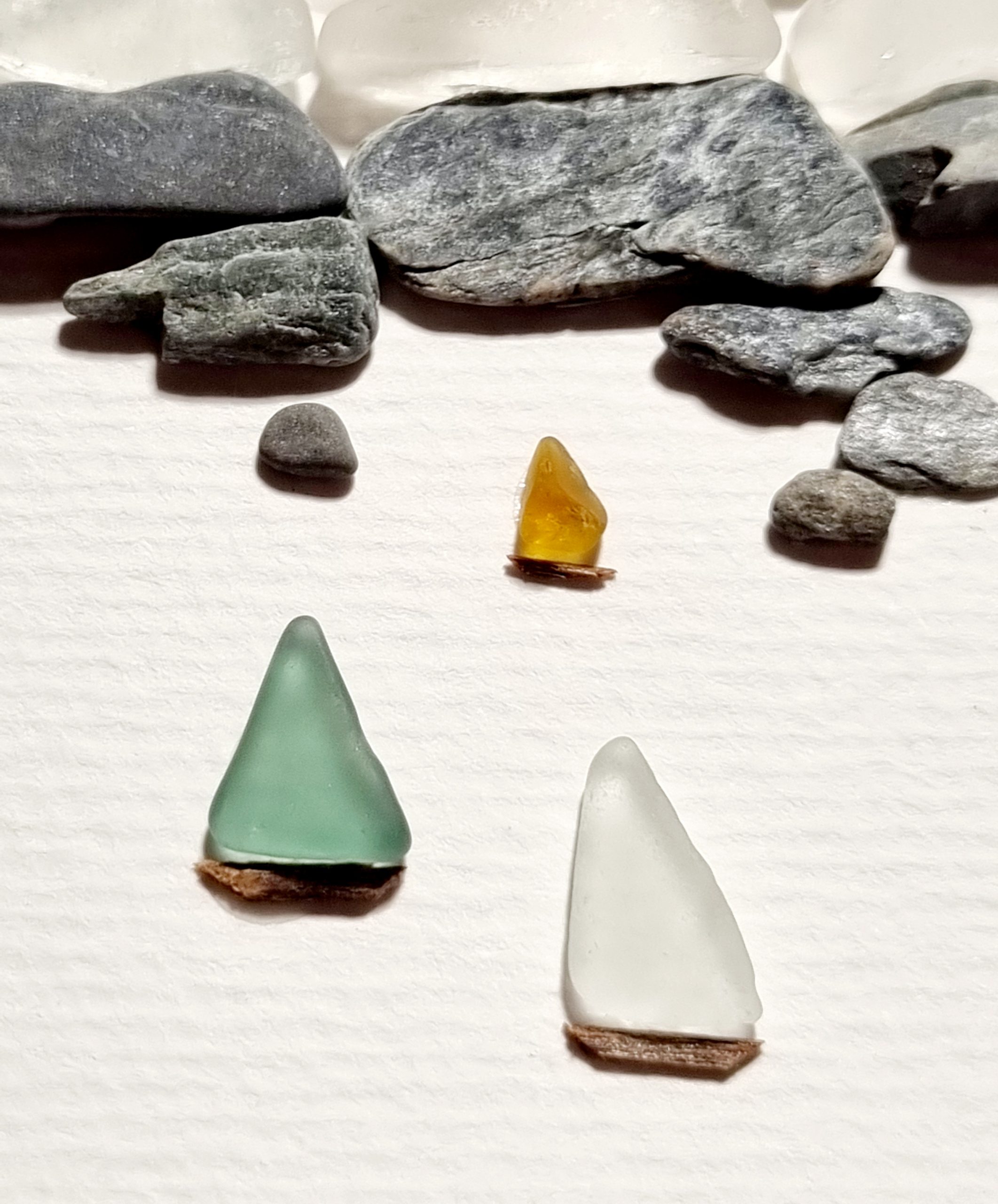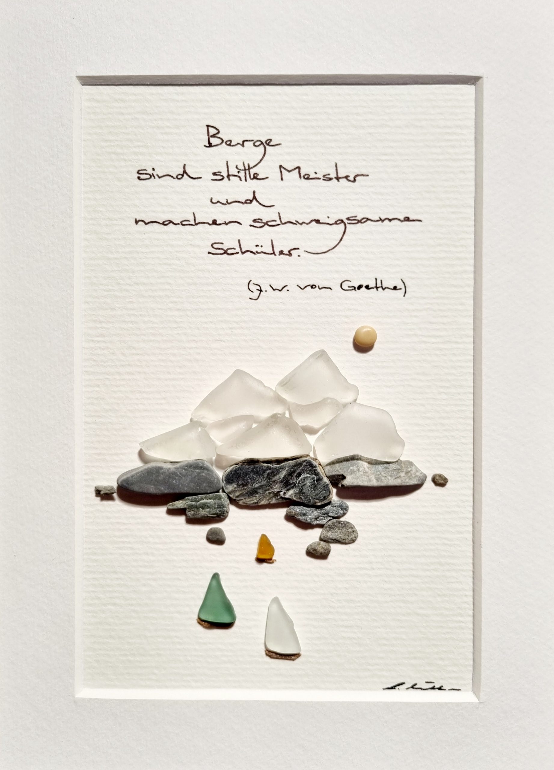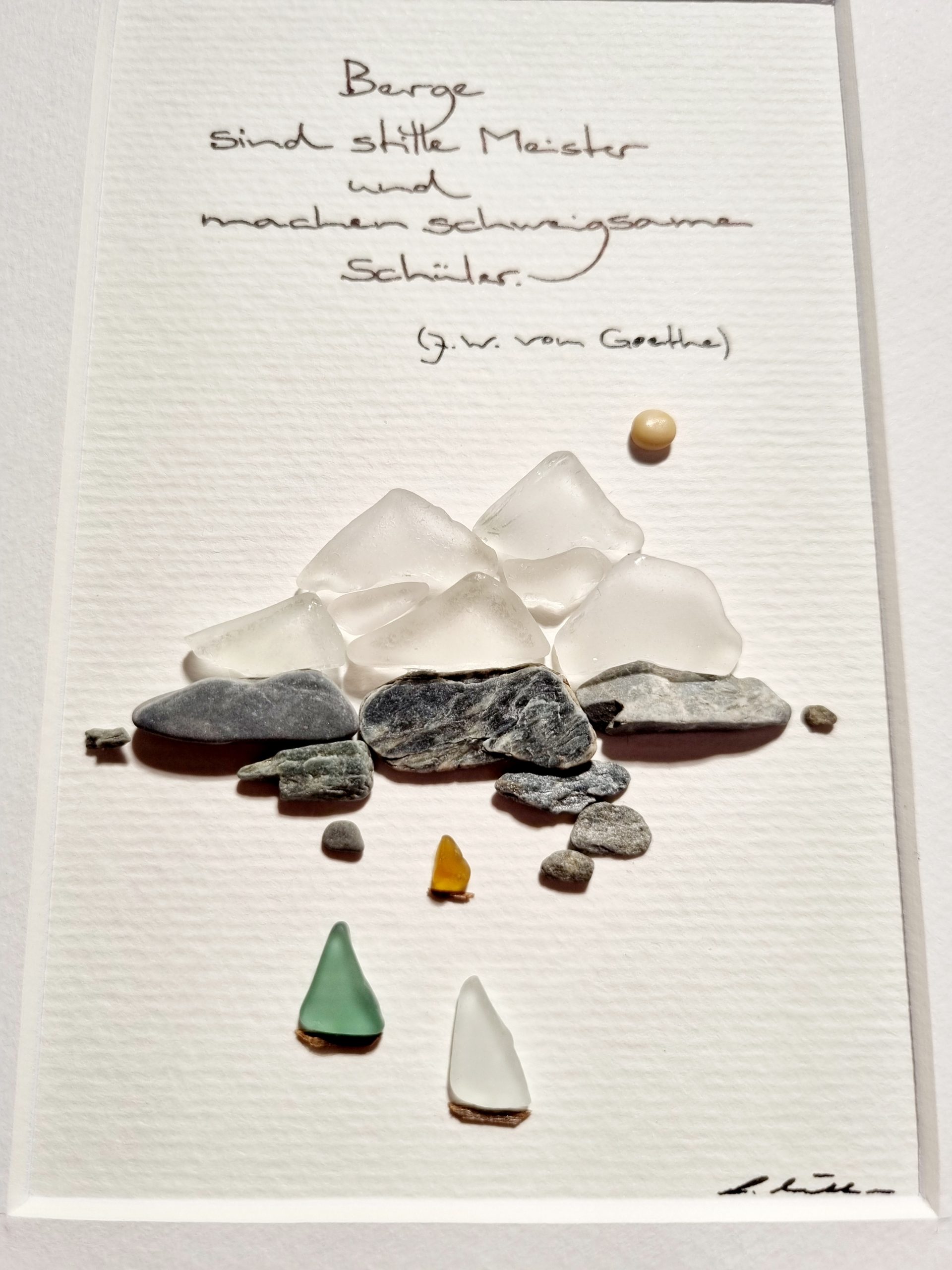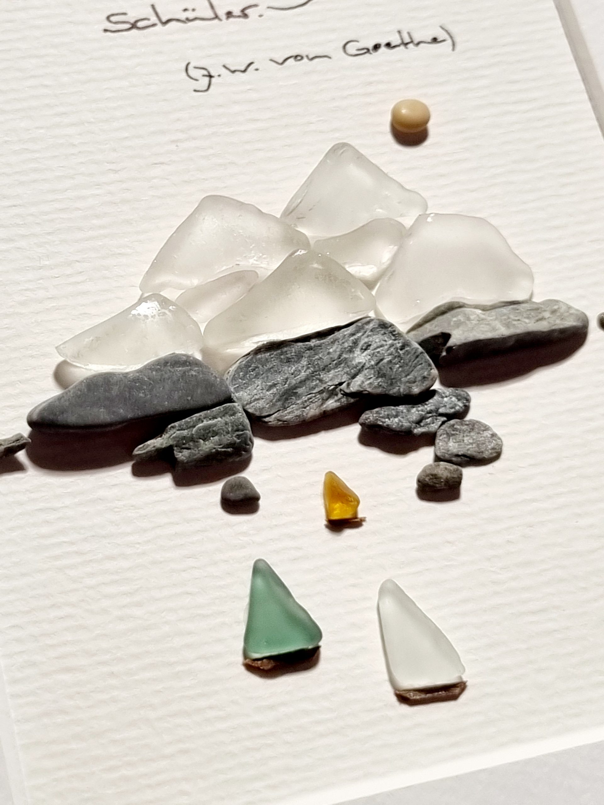 Diese besondere Unikatarbeit setzt sich aus mehreren gleichfarbigen schneeweißen Seeglasfunden von der Ostsee sowie Schiefersteinen aus Südtirol zusammen, welche von einem petrol- sowie amberfarbenen Seeglas und Treibholzabschnitten ergänzt werden.