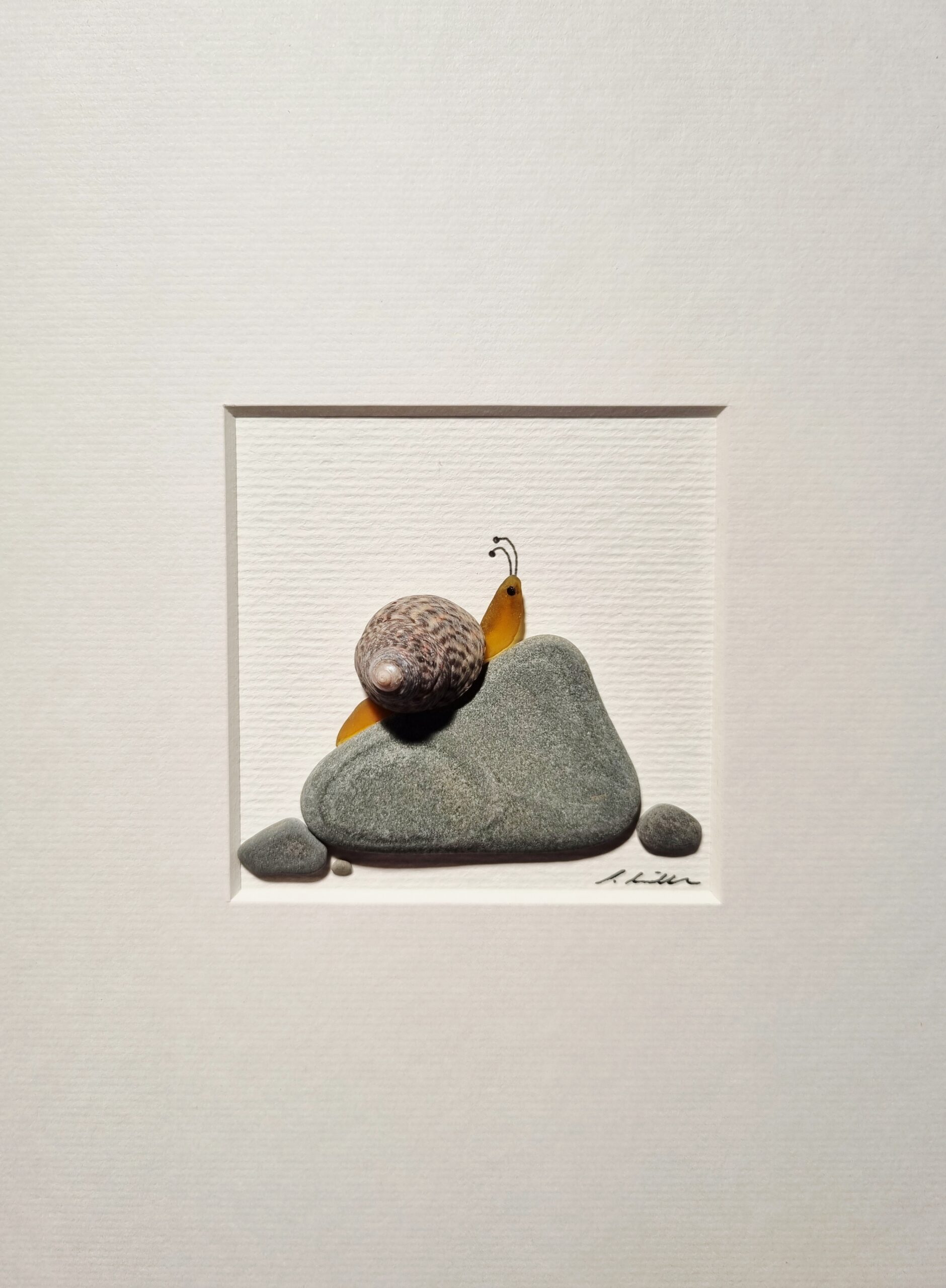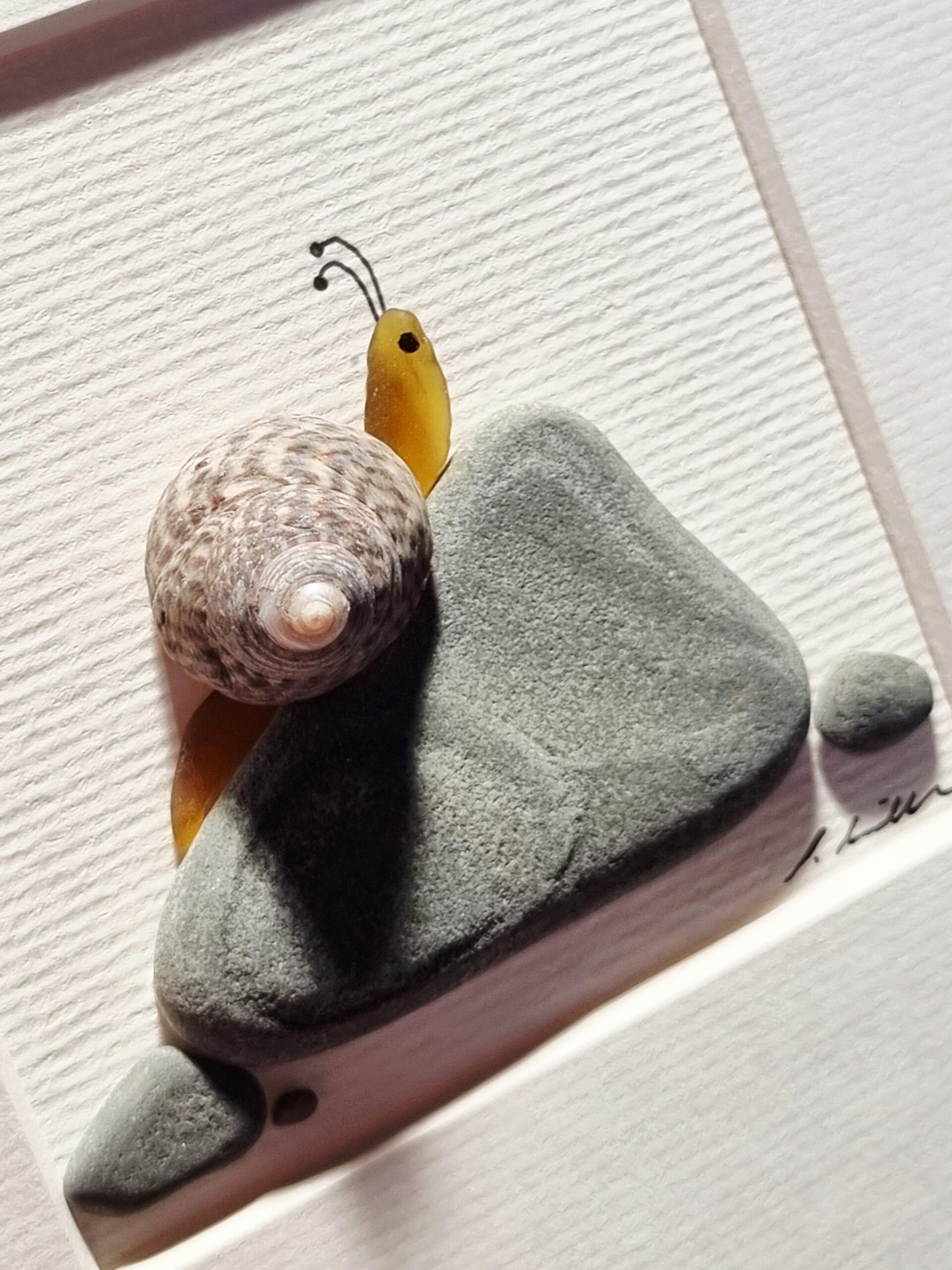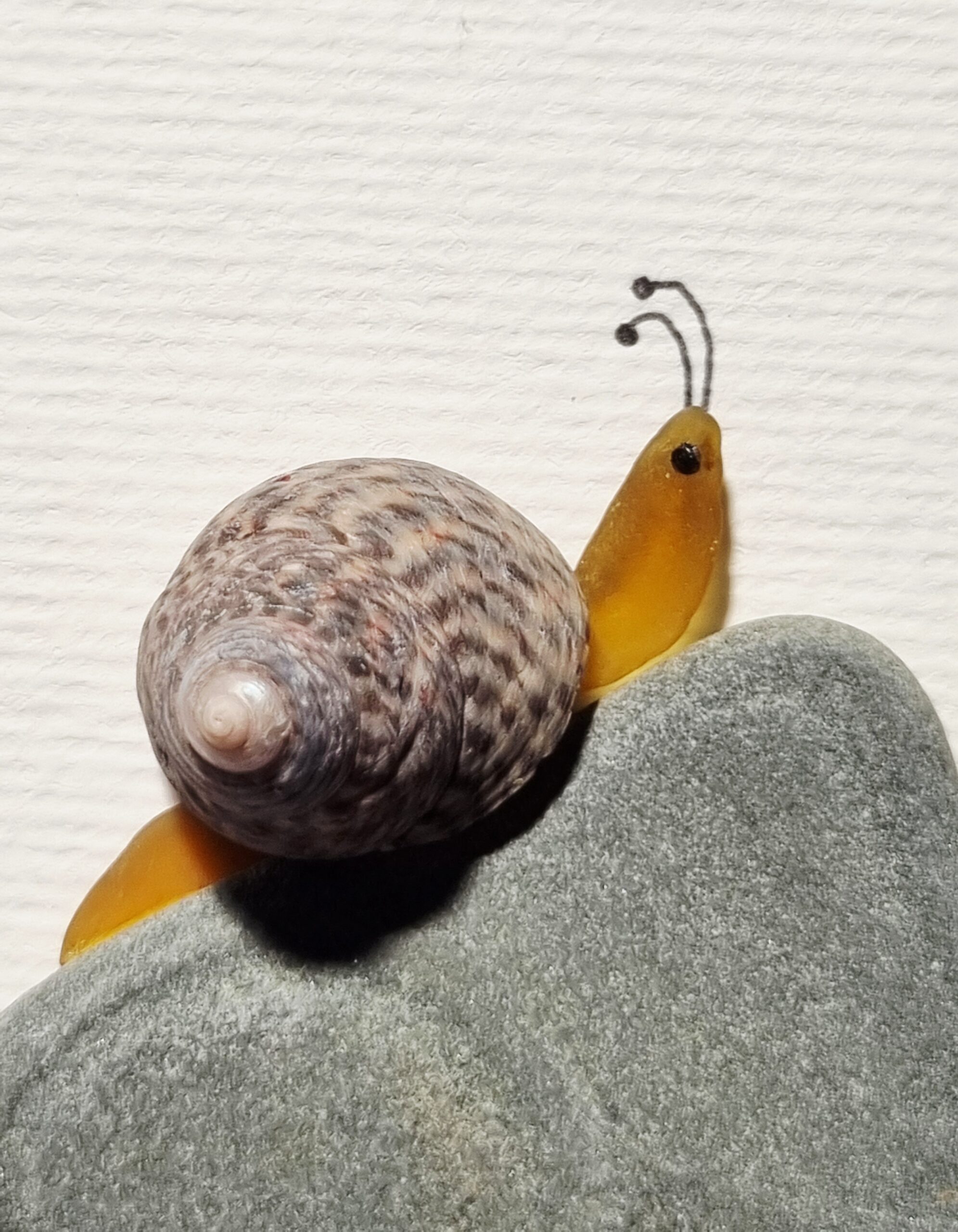 Diese Unikatarbeit eint ein Schneckenhaus aus Italien mit zwei amberfarbenen Seeglassteinen von der Ostsee. Es war eine enorme Zeitarbeit, diese in Farbe, Transparenz und Form zueinander passenden Stücke zu finden und nicht zuletzt mussten sie sich optisch optimal an einen Stein anfügen. Der massive Stein stammt von der Ostsee. Die Schnecke ist ein Liebhaberstück.