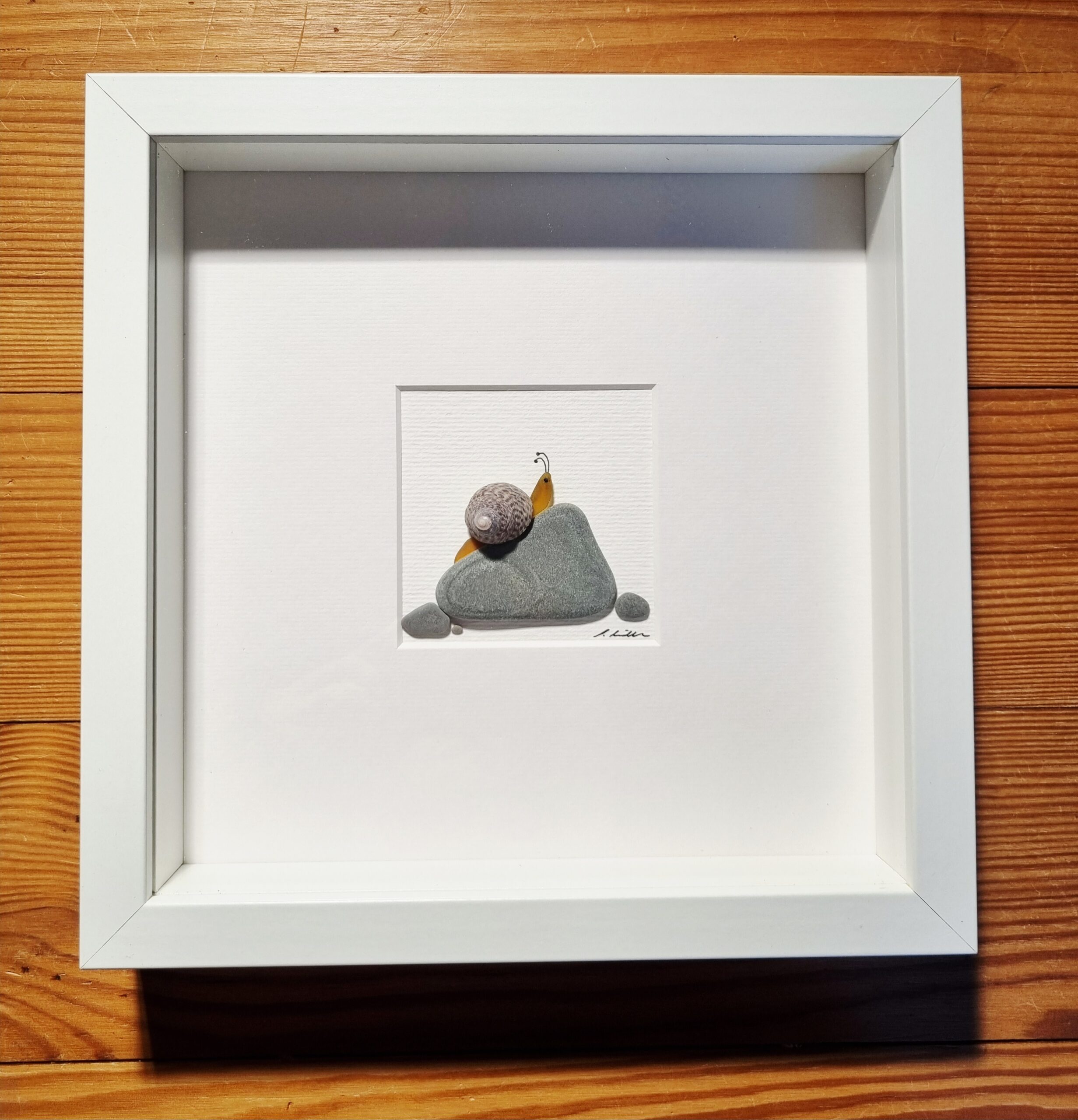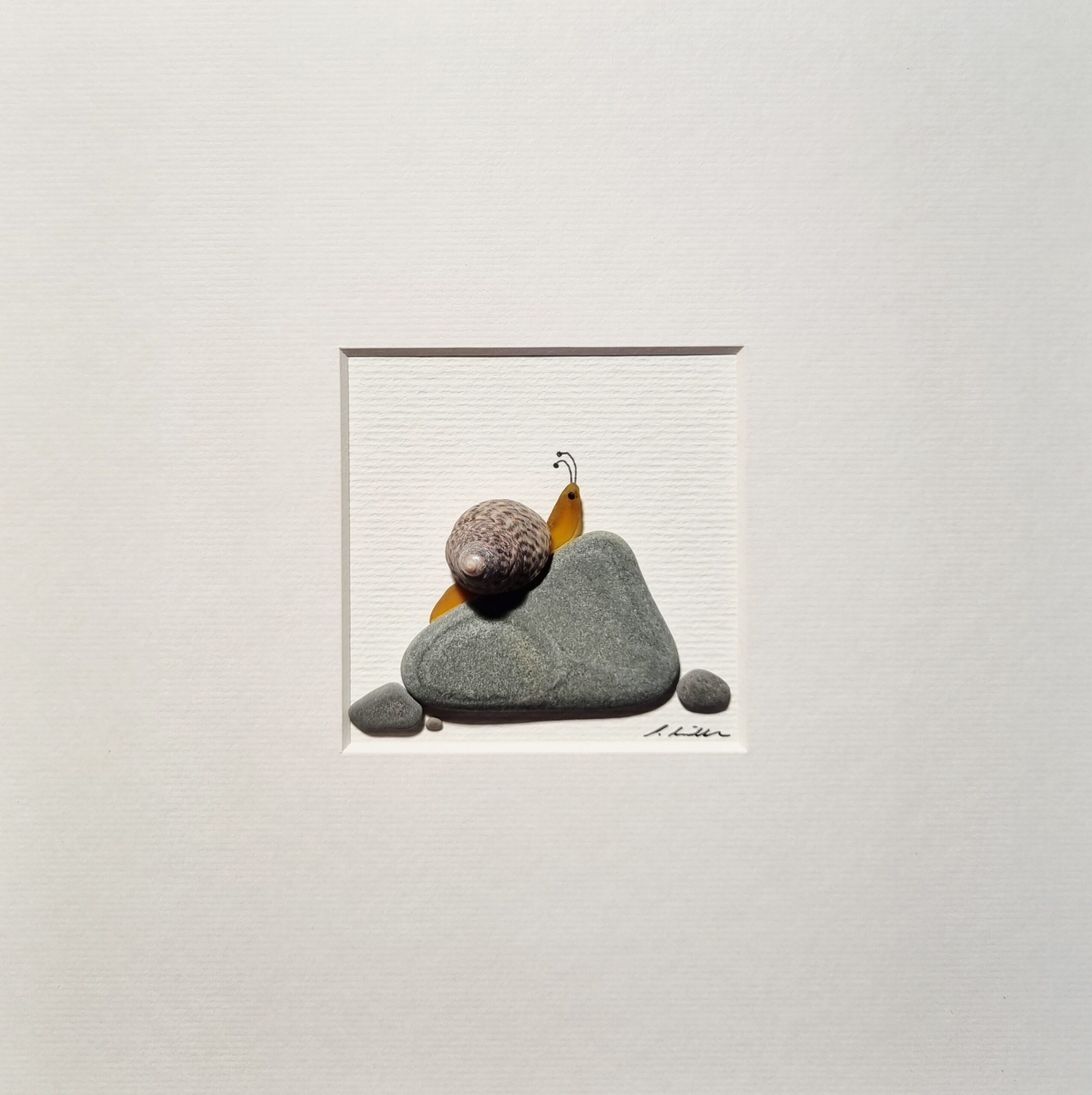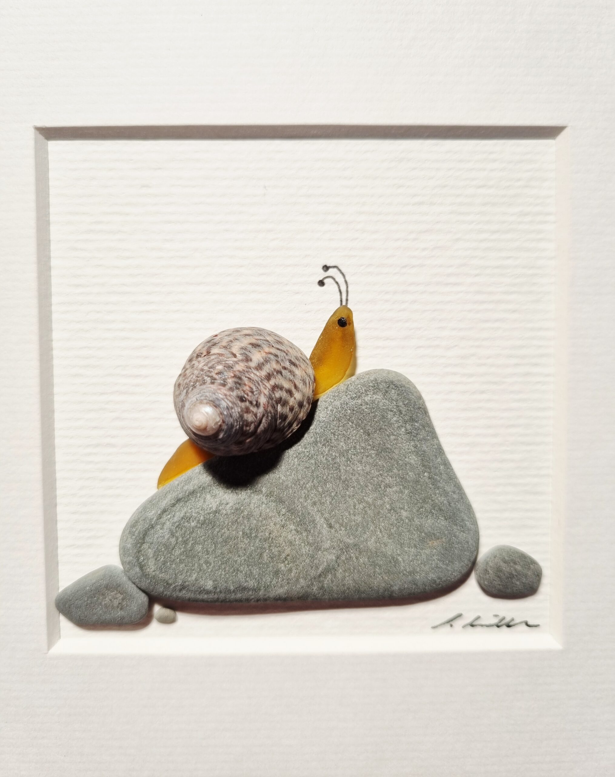 Diese Unikatarbeit eint ein Schneckenhaus aus Italien mit zwei amberfarbenen Seeglassteinen von der Ostsee. Es war eine enorme Zeitarbeit, diese in Farbe, Transparenz und Form zueinander passenden Stücke zu finden und nicht zuletzt mussten sie sich optisch optimal an einen Stein anfügen. Der massive Stein stammt von der Ostsee. Die Schnecke ist ein Liebhaberstück.