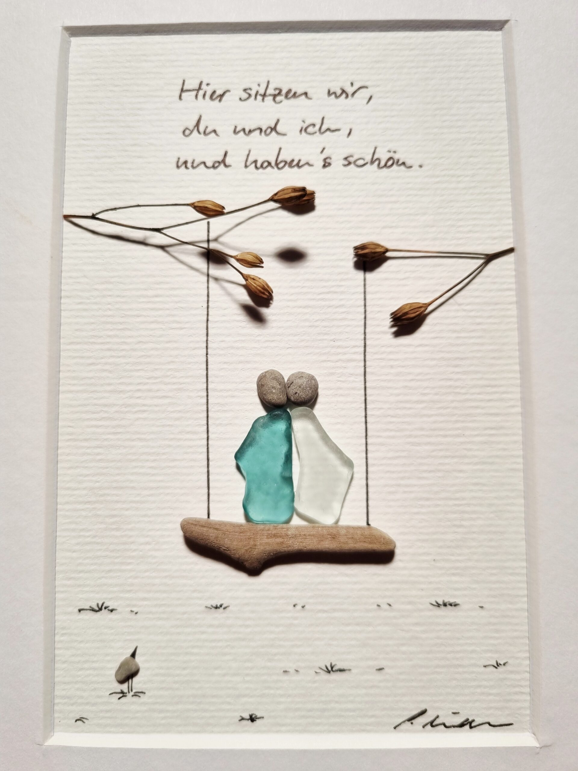 Eine wunderschöne Unikatarbeit mit einem transparenten schneeweißen und einem selten schönen türkisfarbenen Seeglasstein kombiniert mit mallorquinischen Kieseln. Kleine Zweige ergänzen dezent das Pärchen.