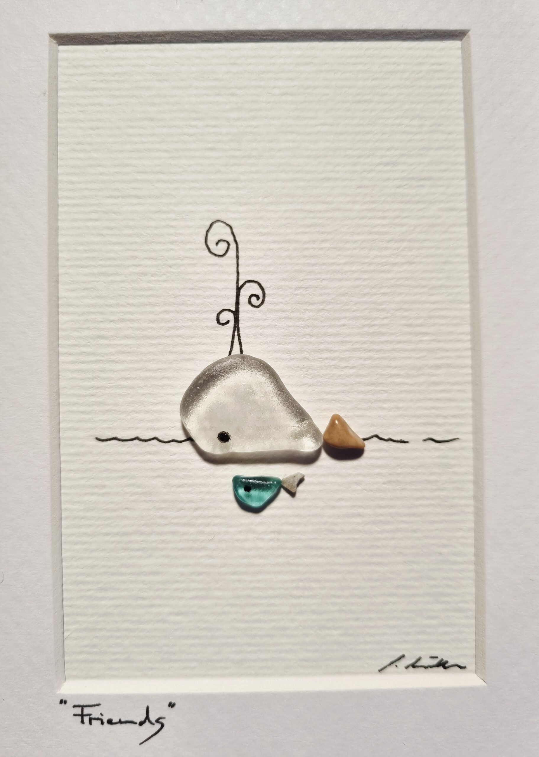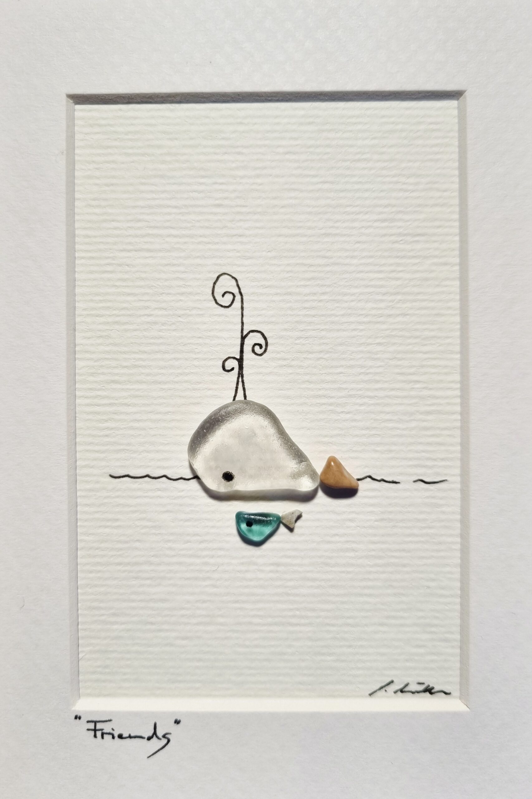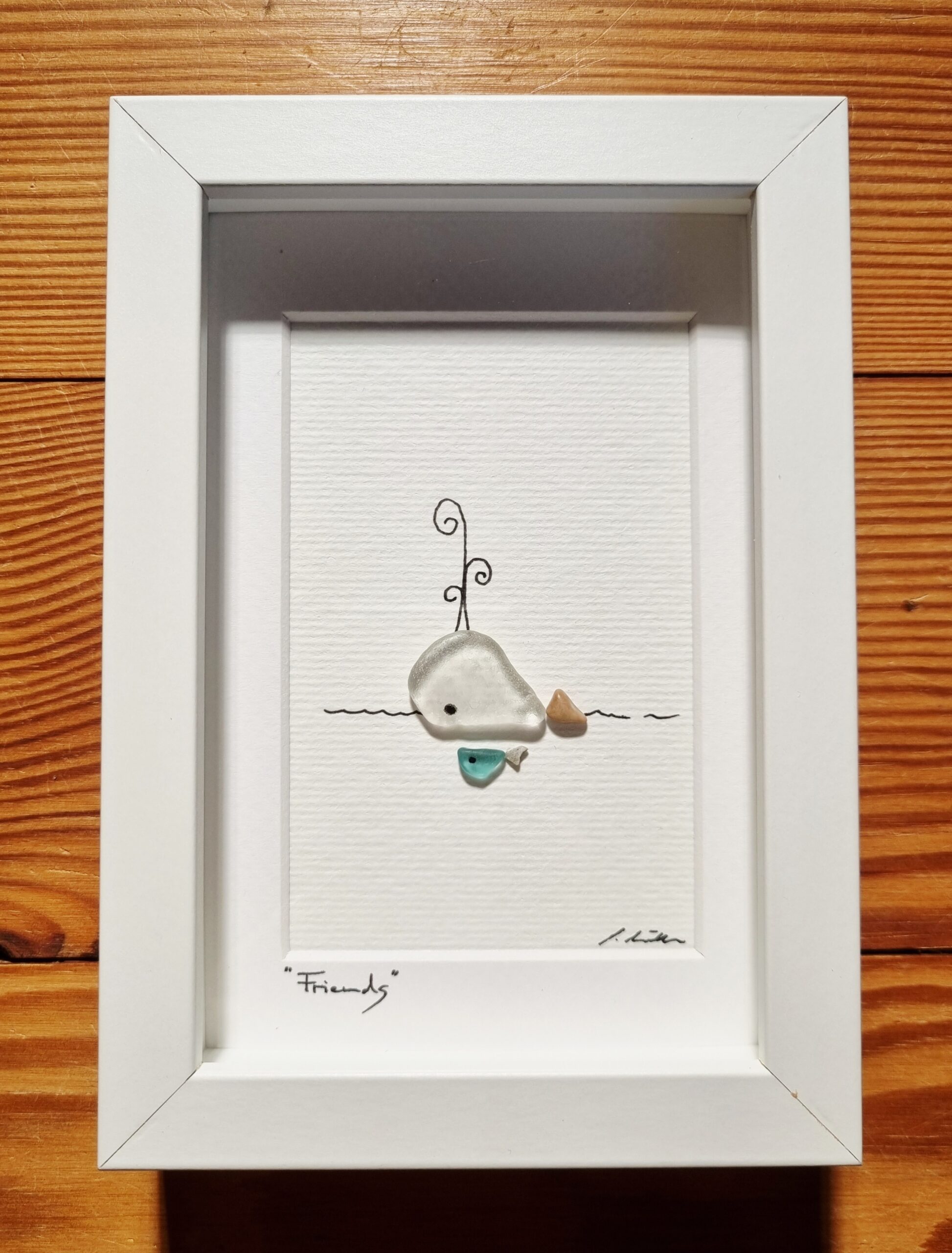 Diese Unikatarbeit ist ein Potpourri verschiedener Ostseegläser und mallorquinischer Kiesel. Eine wunderschöne reduzierte Kombination von einem weißen und einem türkisgrünen Seeglassteinchen.