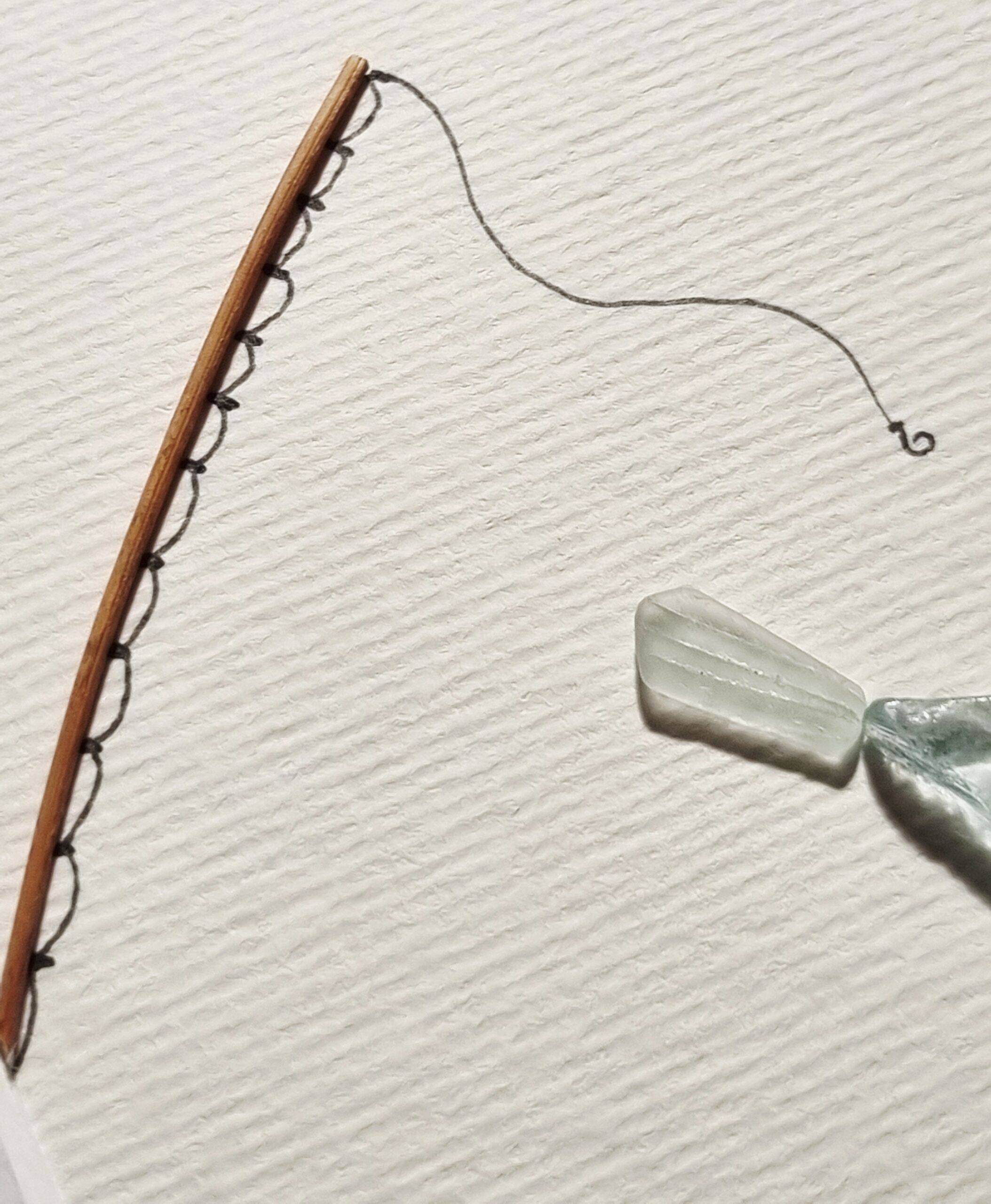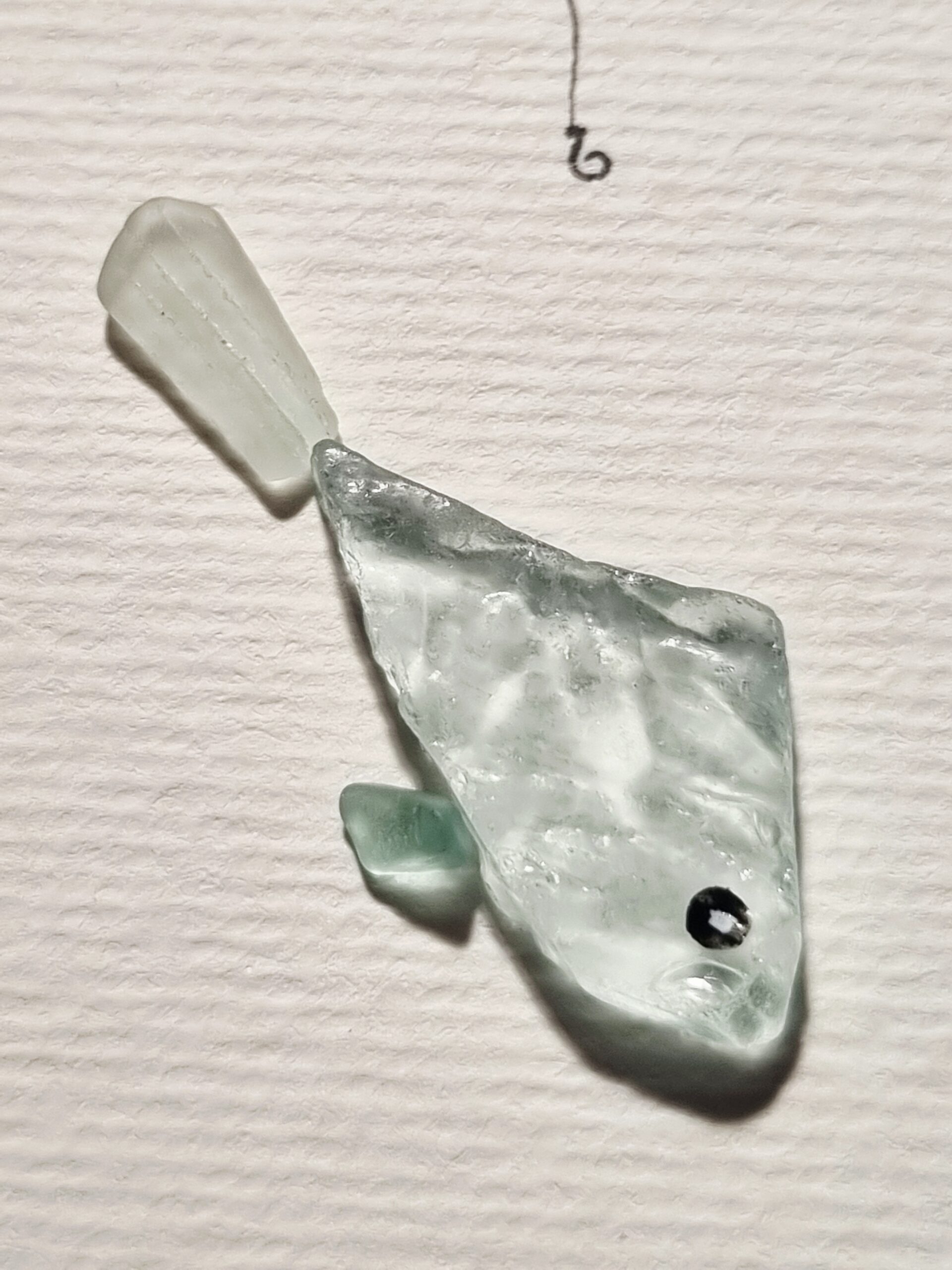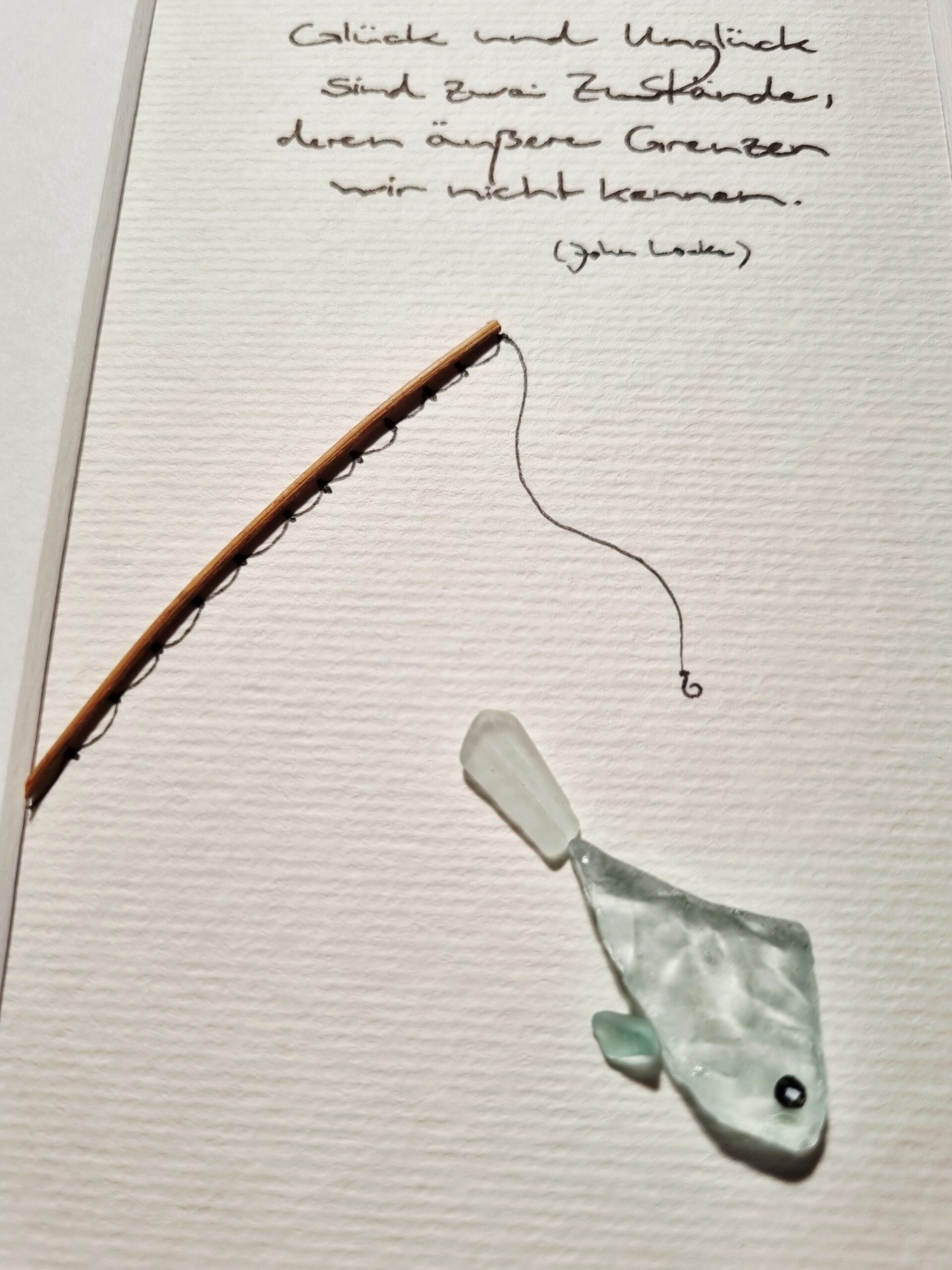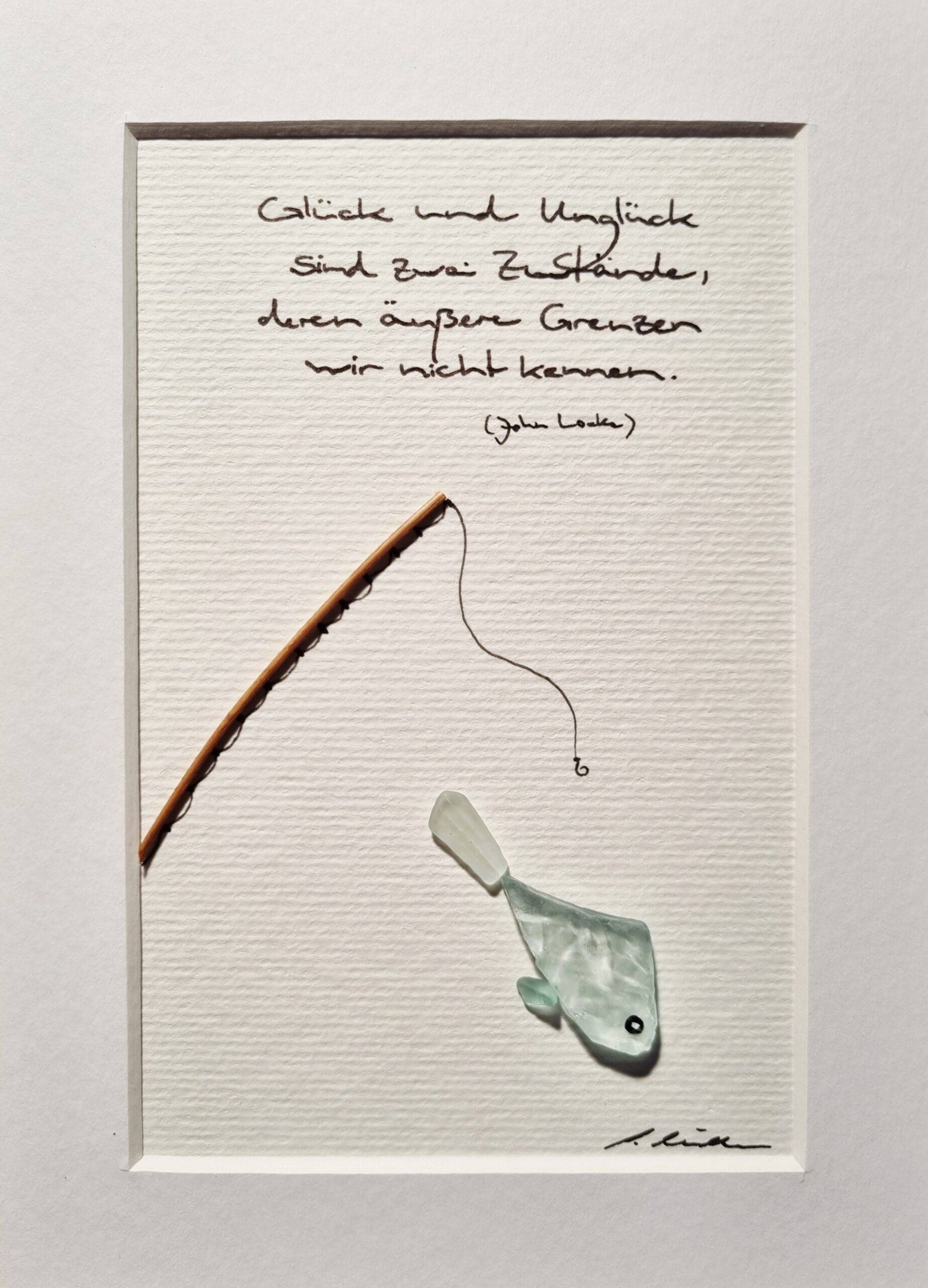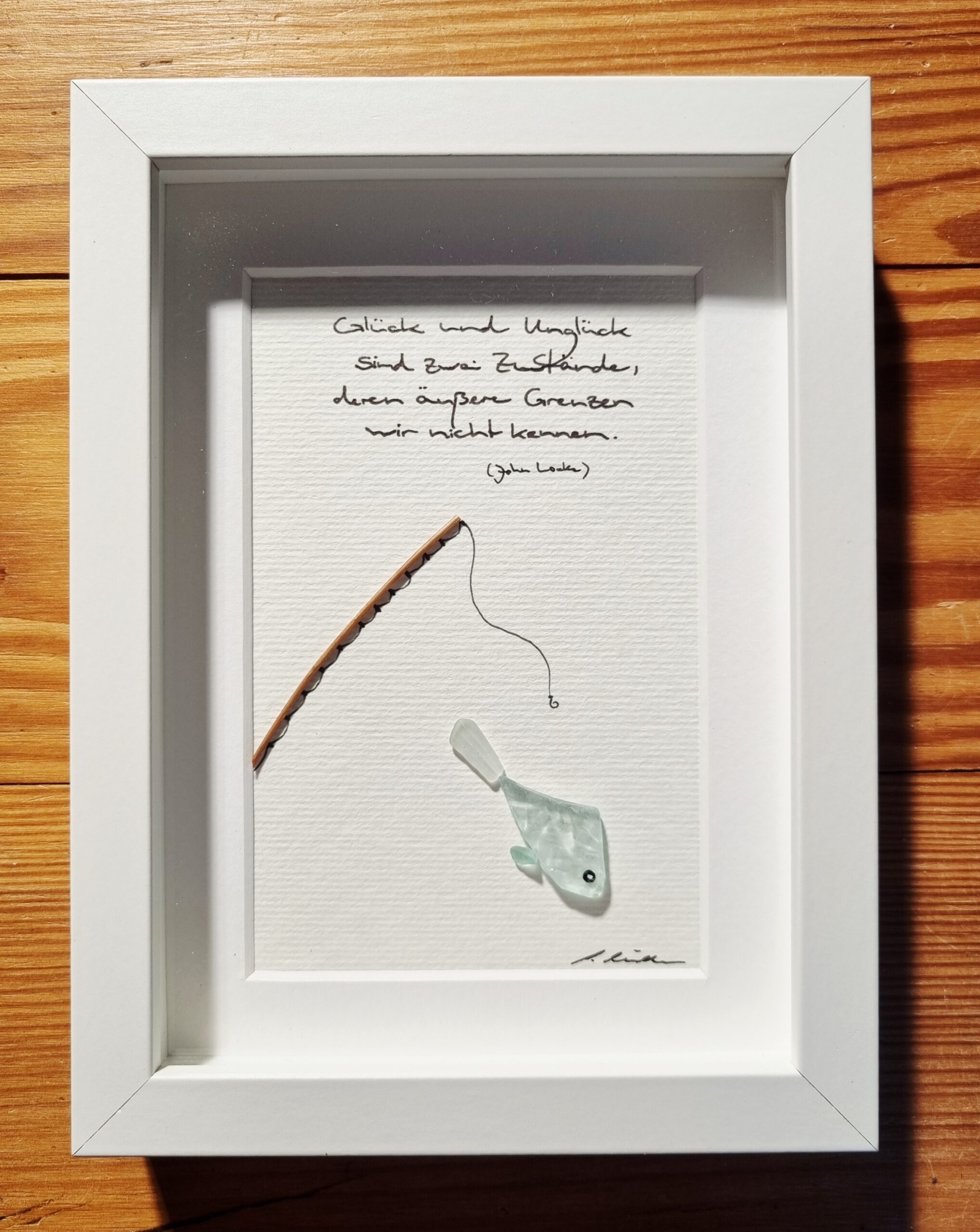 Dieses minimalistische Kunstwerk kombiniert einen wunderschönen Strukturseeglasfund mit türkisen und weißen Seeglassteinchen. Der Fisch und die skizzierte Angel erzeugen ein leichtes, verspieltes Motiv. Ein Zitat von John Locke ergänzt das Bild und verleiht ihm eine nachdenkliche Note. Glück und Unglück sind subjektiv.