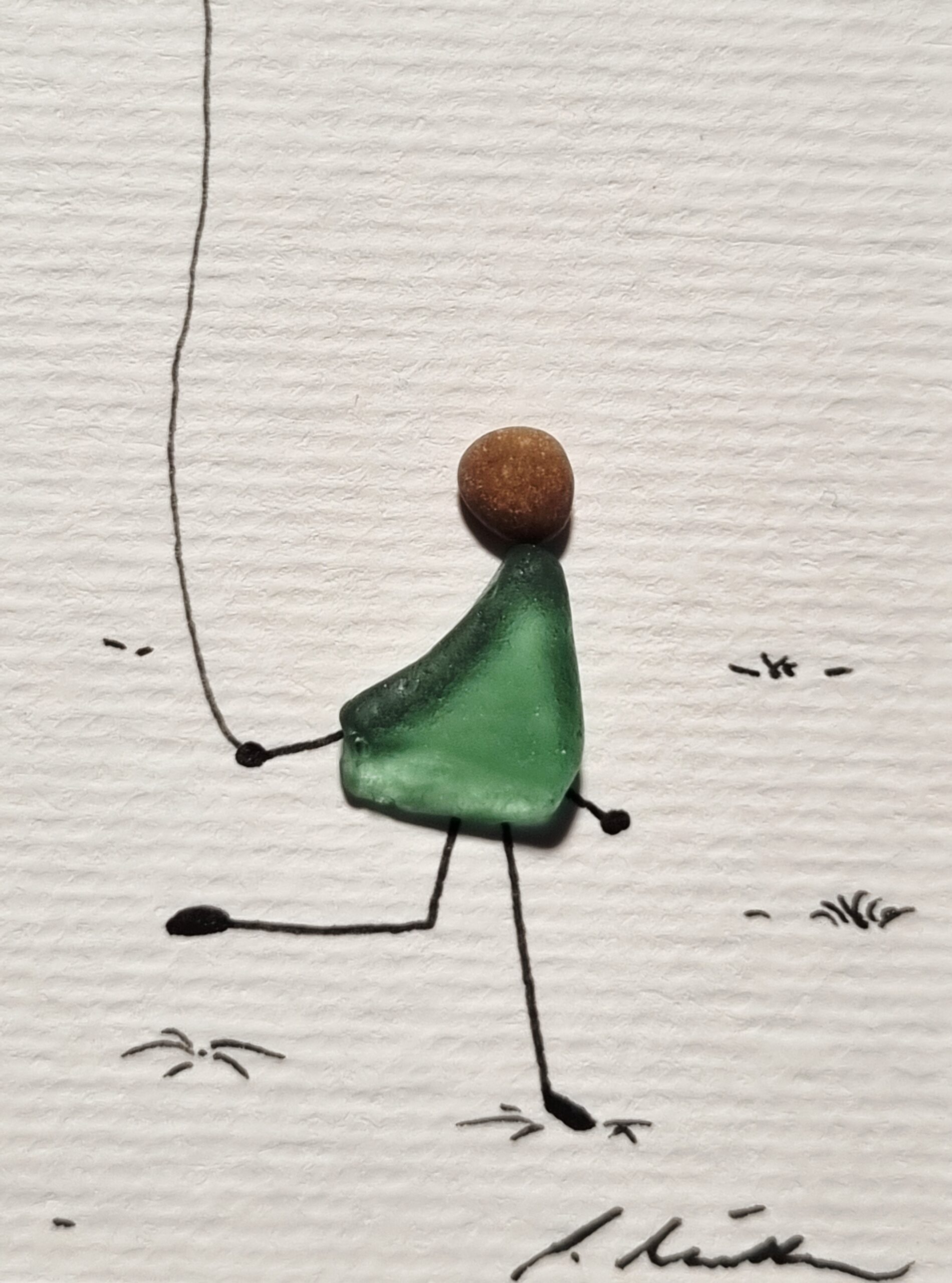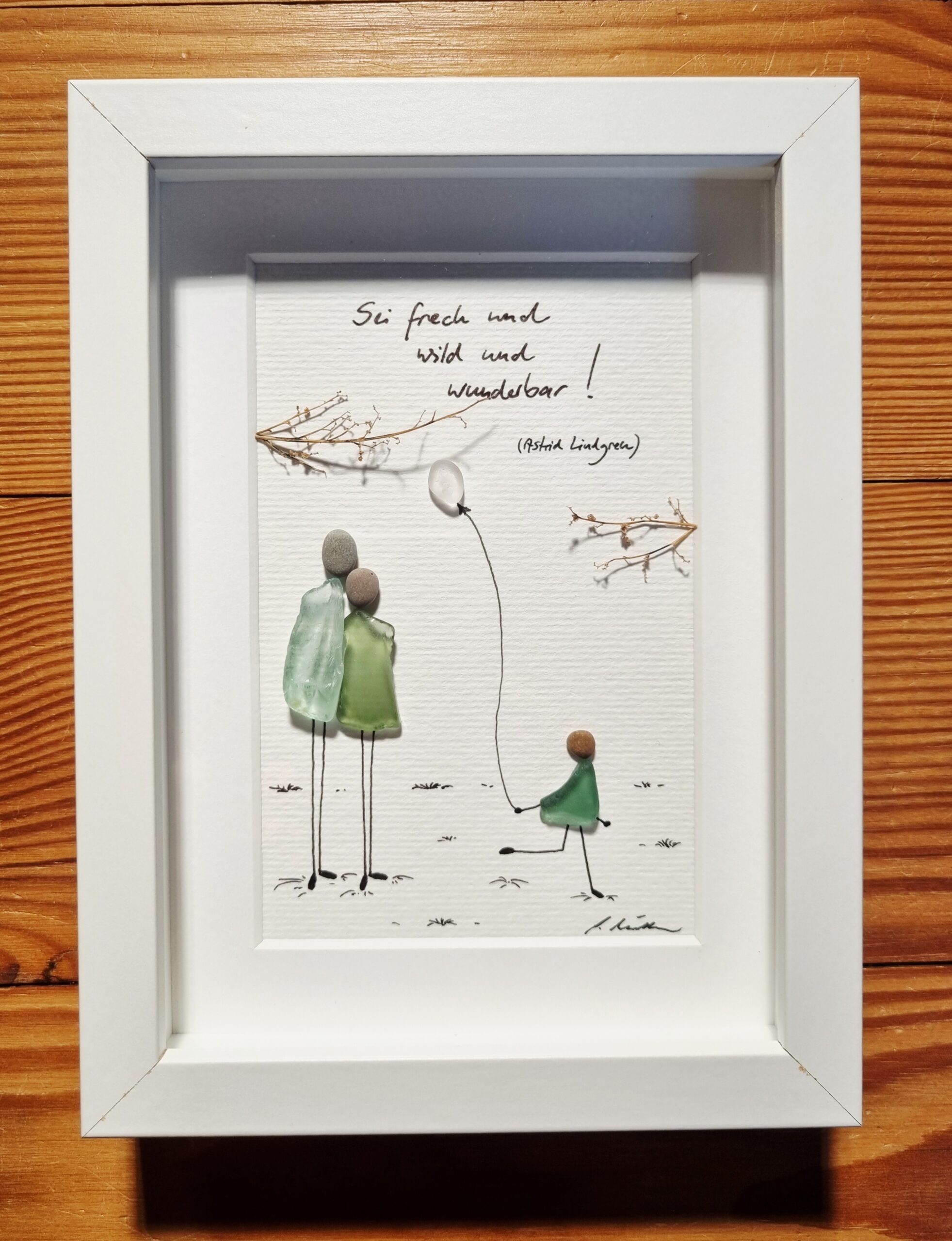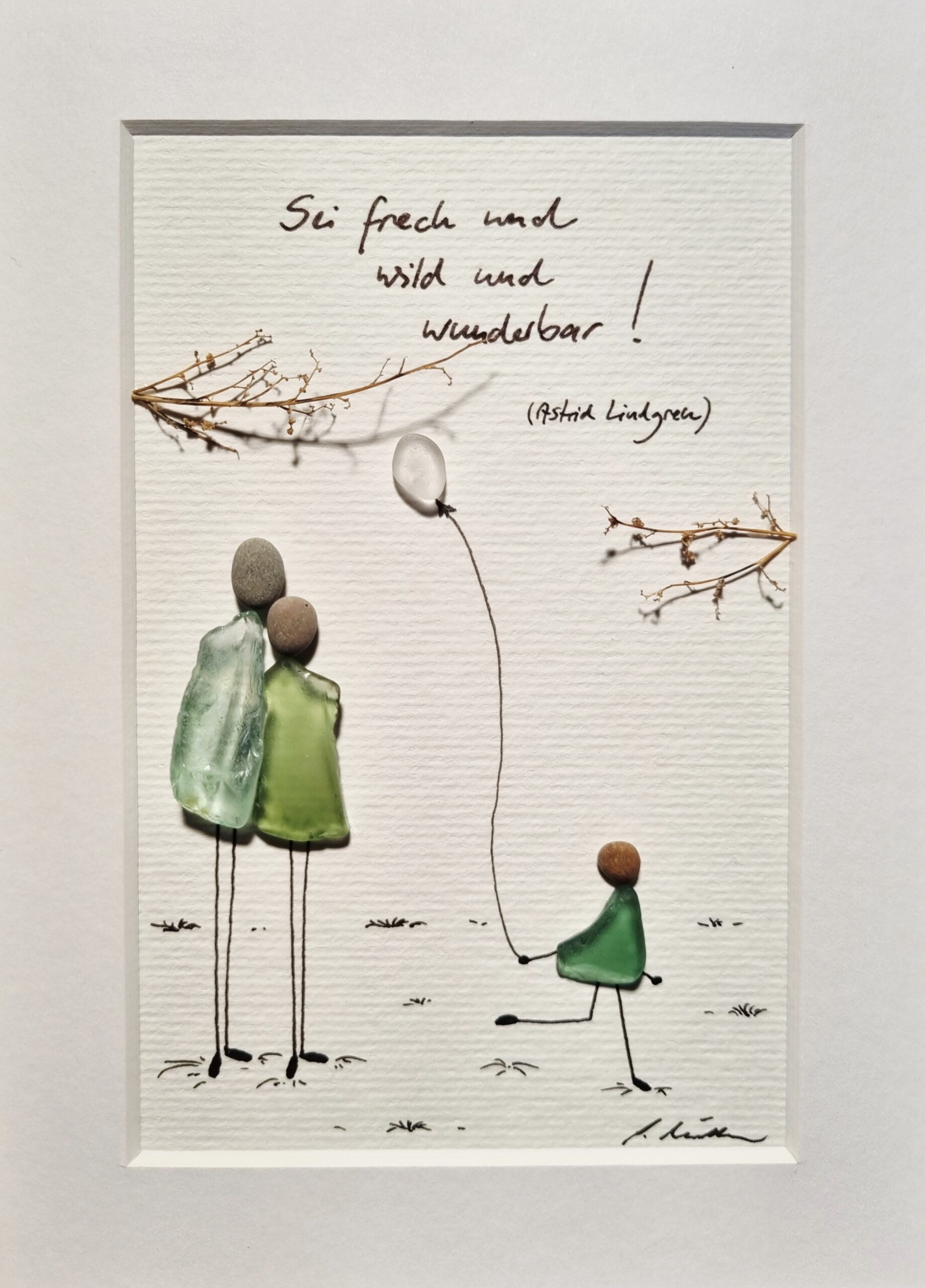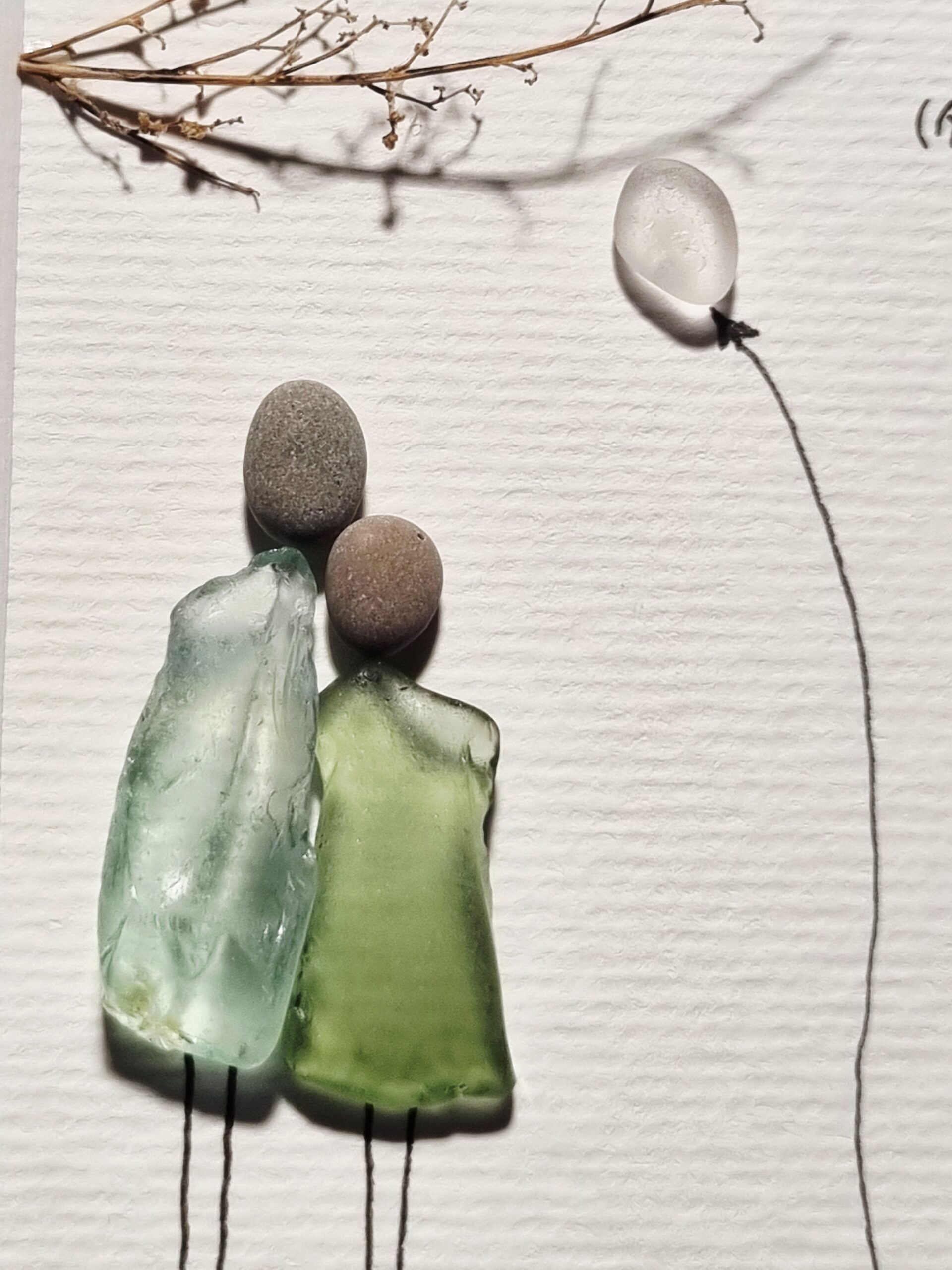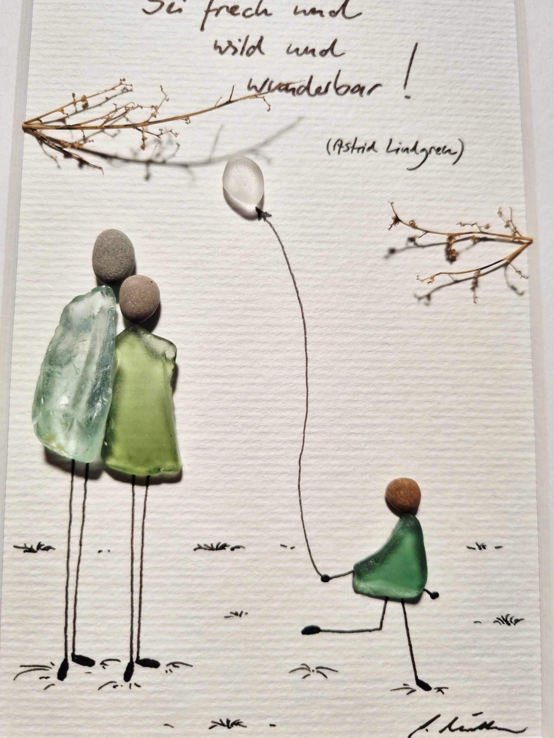 Unikatarbeit aus wunderschönen Seegläsern mit Grünnuancen und einem schneeweißen Seeglasstein ergänzt von Zweigabschnitten.