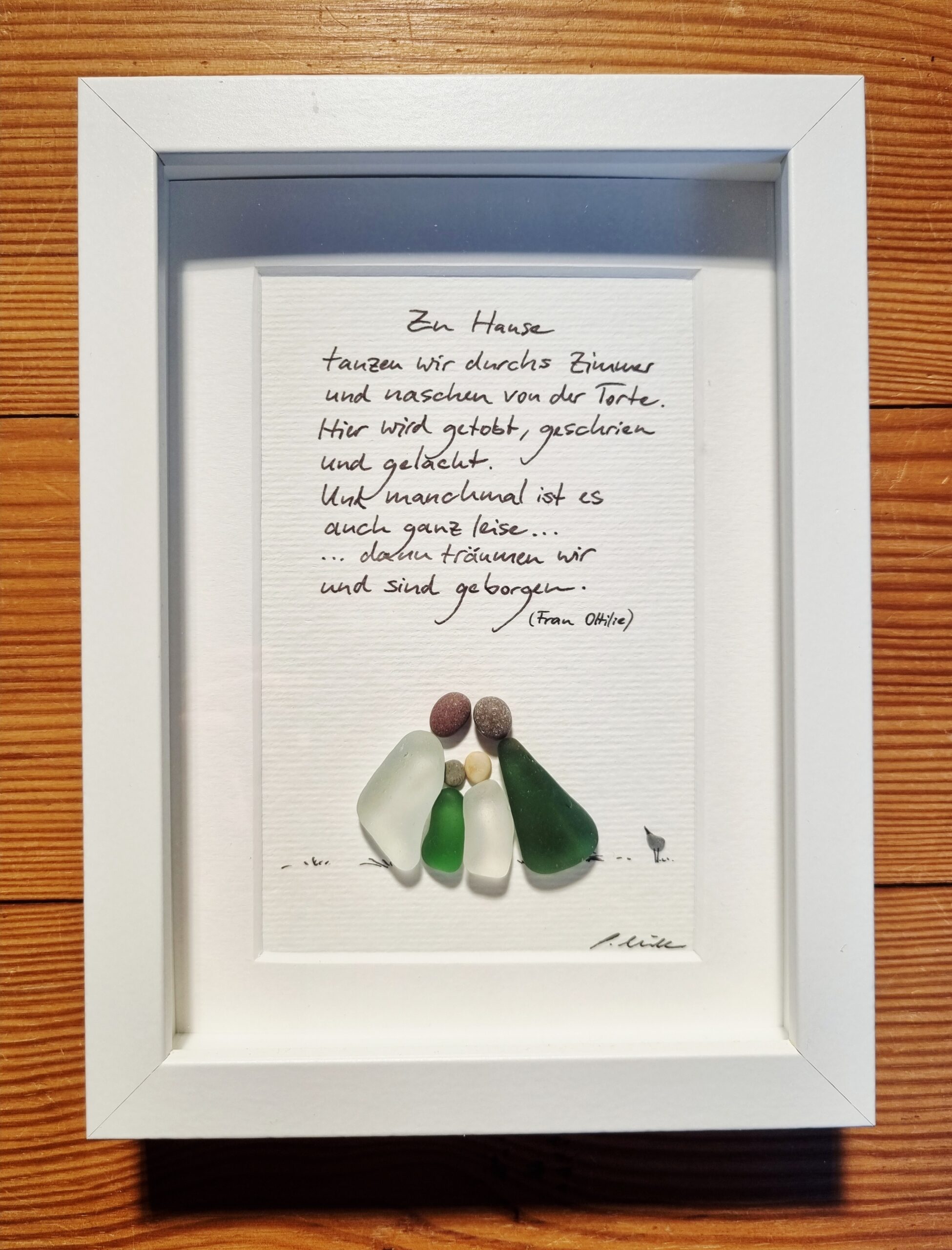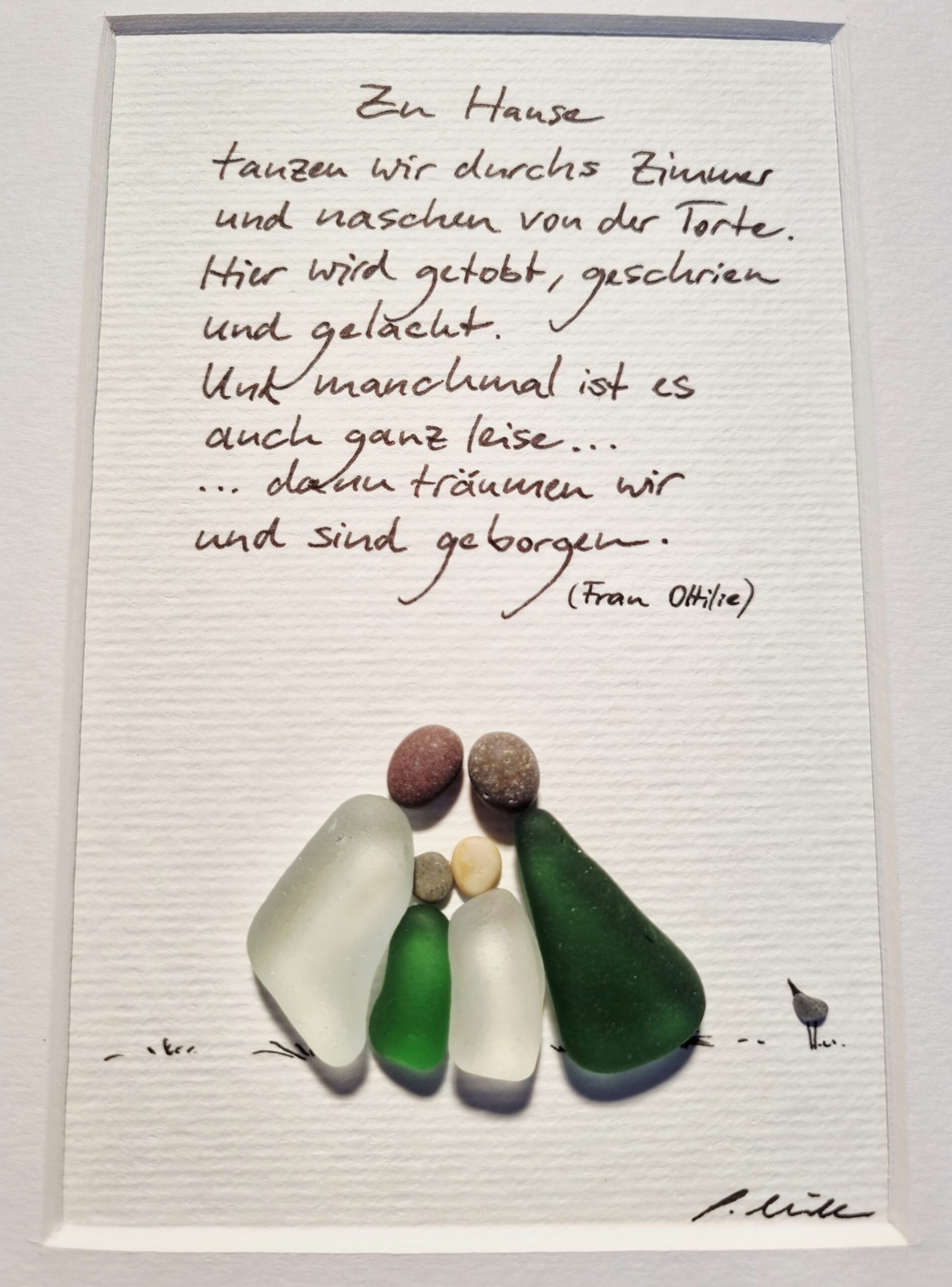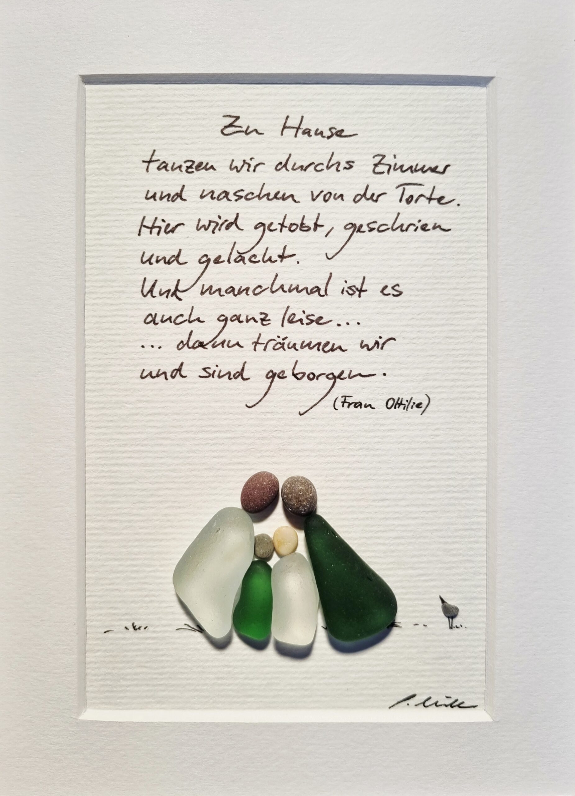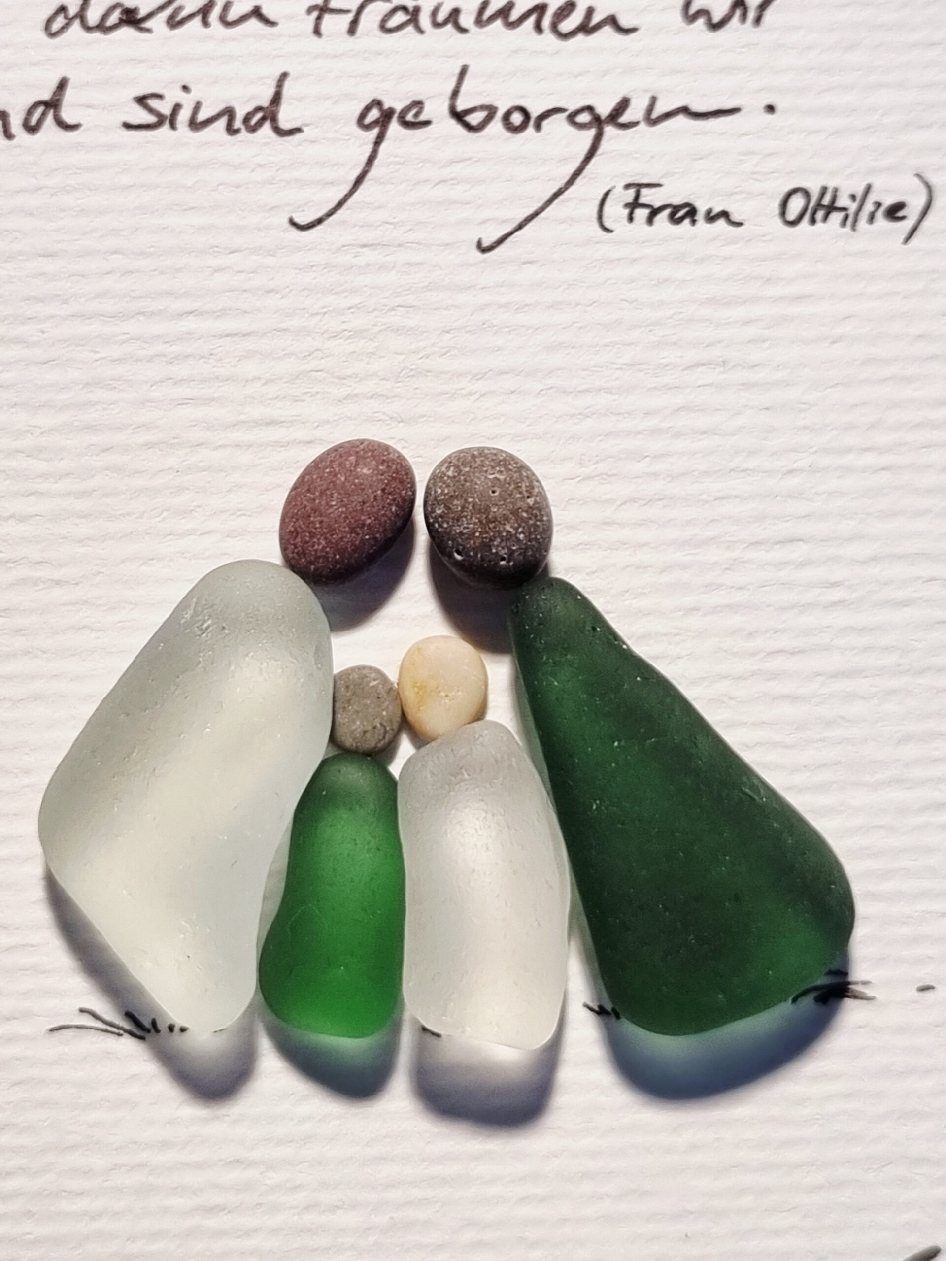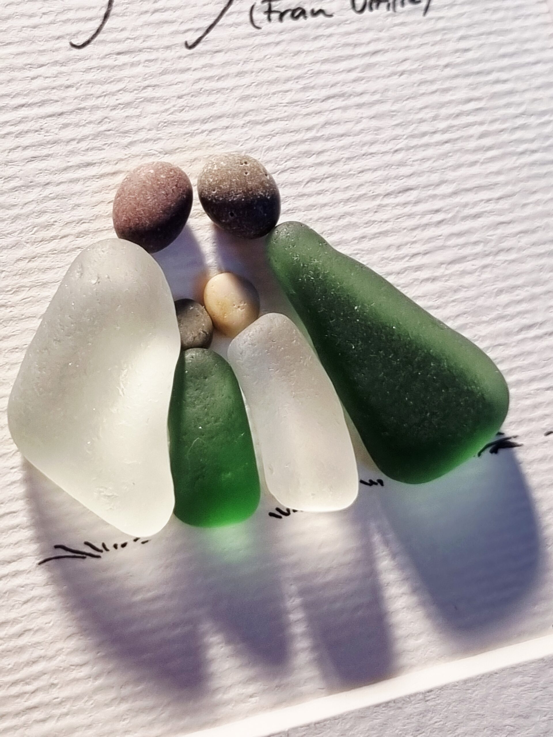 Diese wunderschöne Unikatarbeit setzt sich aus schneeweißen und grünen Seeglasfunden zusammen (Ostsee, Nordsee und Costa Brava) in Kombination mit mallorquinischen Kieseln.